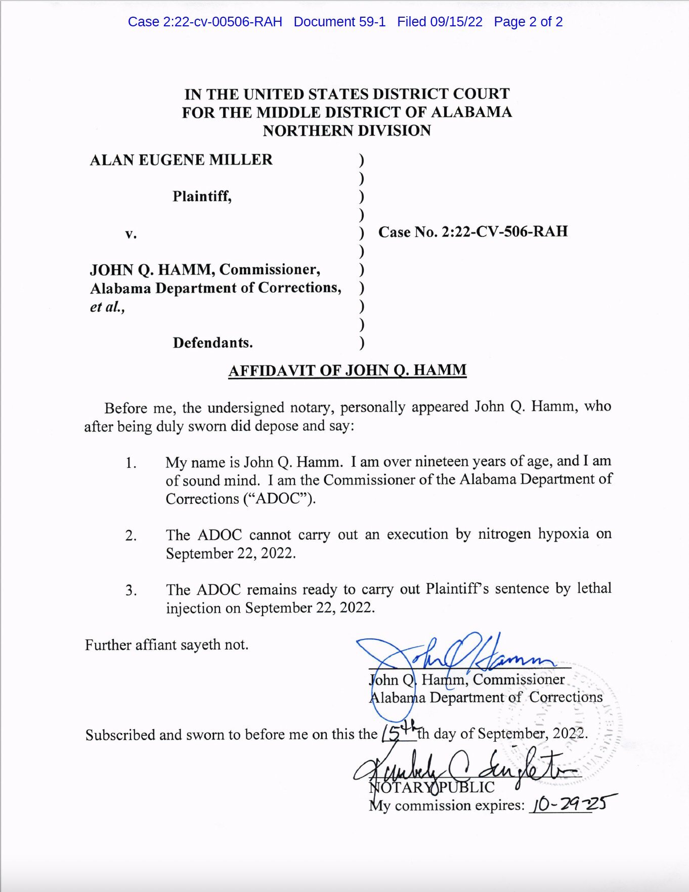 Hamm’s affidavit said that ADOC “remains ready to carry out [Miller’s] execution by lethal injection on September 22, 2022.”