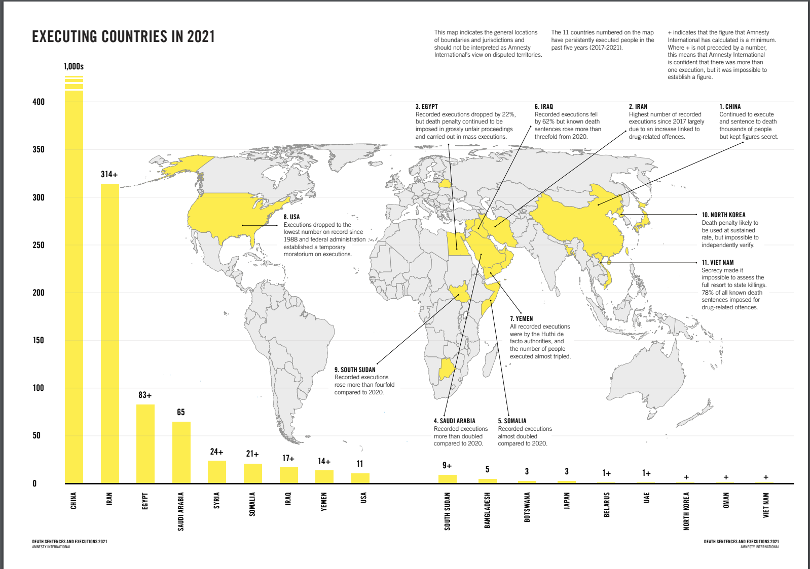 Amnesty International Global Report: Death sentences and executions 2021, Amnesty International, May 24, 2022; Amnesty International, Death Penalty 2021: State-sanctioned killings rise as executions spike in Iran and Saudi Arabia, May 24, 2022; Amnesty International, Death Penalty 2021: Facts and Figures, May 24, 2022; Jennifer Hassan, Executions increased as pandemic rules eased in 2021, report finds, Washington Post, May 24, 2022; Executions surge 20 percent in 2021 led by China, Iran: Amnesty, Al Jazeera, May 24, 2022; Egypt issued highest number of death sentences worldwide in 2021, Middle East Eye, May 24, 2022.