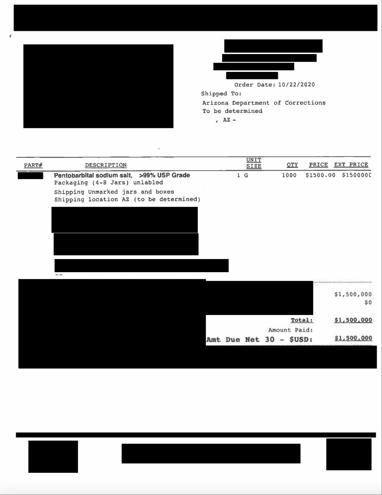 Records obtained by The Guardian show that, in October 2020, Arizona ordered 1,000 vials of the barbiturate pentobarbital. Each one-gram vial cost the state $1,500, for what the newspaper described as a “jaw-dropping” total of $1.5 million. A heavily redacted invoice (click to enlarge picture) shows that the state ordered 4 – 8 “unlabeled” jars to be shipped in “Unmarked jars and boxes” to an Arizona location “to be determined.” The state’s execution protocol calls for five grams of the drug, so the vials would be enough for 200 executions in a state that has 119 people on death row.