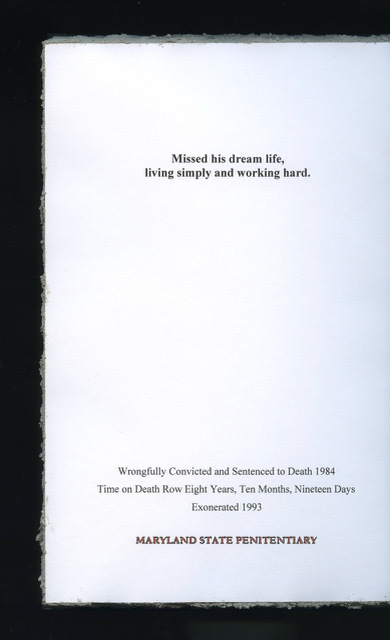 Each book highlights the life of an exoneree as a biography, including the name of the exoneree and a subtitle conveying details about their lives; unlike a normal book, the pages of these books are sealed shut with cement to draw parallels to a prison cell. Only on the final page is there more information about the exoneree, beginning with a statement regarding a missed life event or milestone, such as “building a credit history.” This information is followed by the year and place they were sentenced to death, amount of time wrongfully incarcerated on death row, and the year exonerated, details that are also found in the Death Penalty Information Center’s Innocence Database. Each of these biographies is displayed atop of floating shelves of untitled books, which pay “homage to those wrongly convicted but who perished on death row.”