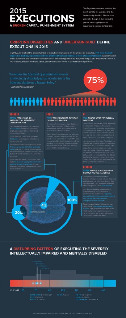 Three quarters of American executions in 2015 involved cases of“crippling disabilities and uncertain guilt,” according to a report by the Charles Hamilton Houston Institute for Race and Justice at Harvard University. Saying that the 2015 executions revealed“a broken capital punishment system,” the report found that, “[o]f the 28 people executed [in 2015], 75% were mentally impaired or disabled, experienced extreme childhood trauma or abuse, or were of…