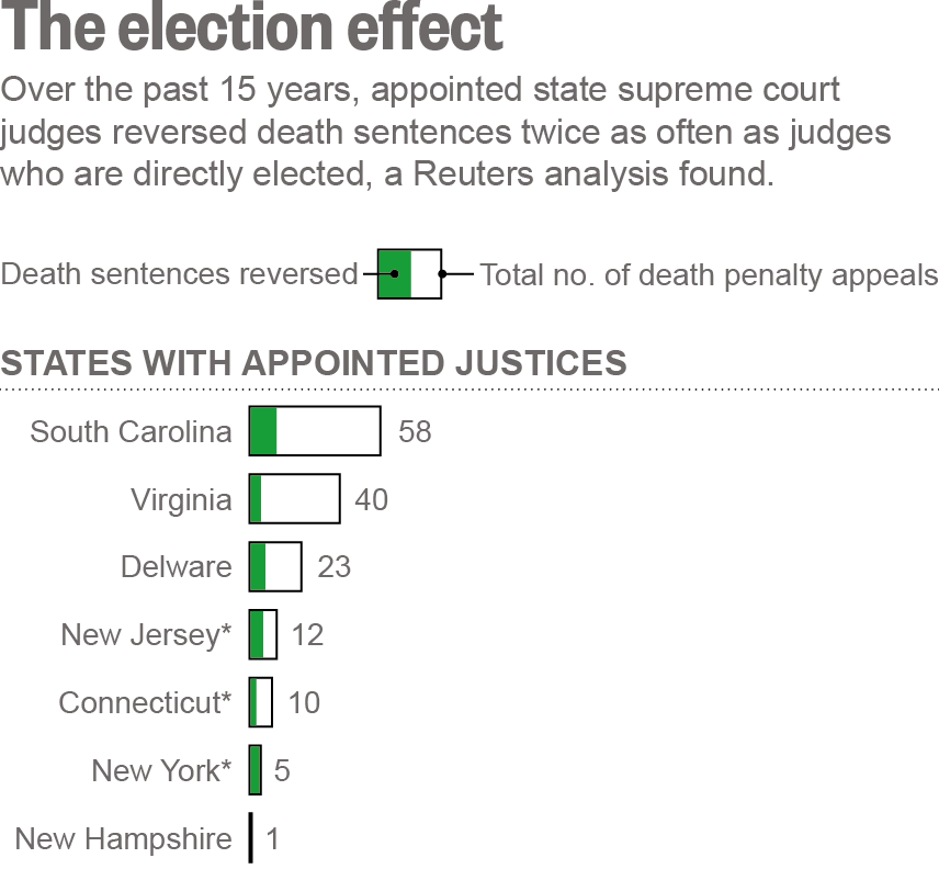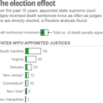 A Reuters analysis of more than 2,000 state Supreme Court rulings in capital cases has found that elected judges are much less likely to overturn death sentences than judges who are appointed. In the 15 states in which the state Supreme Court is directly elected, justices overturned death sentences only 11% of the time as compared to a 26% reversal rate in the 7 states in which justices are appointed. 15 states have a hybrid system, where justices are initially…