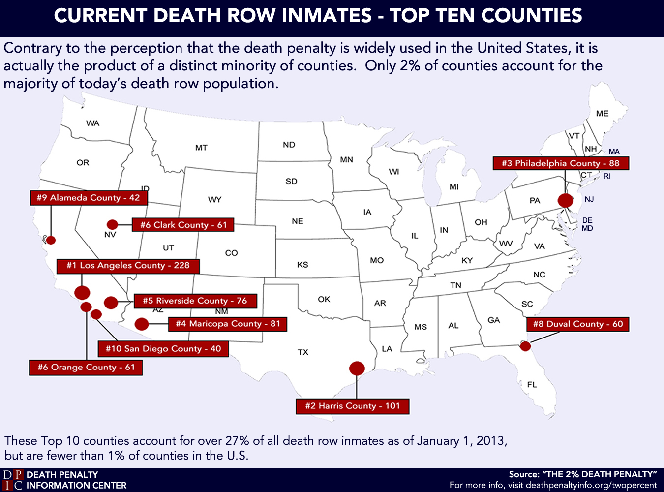 (Click to enlarge) According to a report by the Christian Science Monitor, Duval County, Florida, has the highest per capita rate for inmates on death row of any U.S. county. Duval has sentenced one person to death for every 14,000 residents. It is among the 2% of counties in the U.S. reponsible for a majority of all inmates on death row as of 2013, as described in DPIC’s report, The 2% Death Penalty. Duval County ranked 8th,…