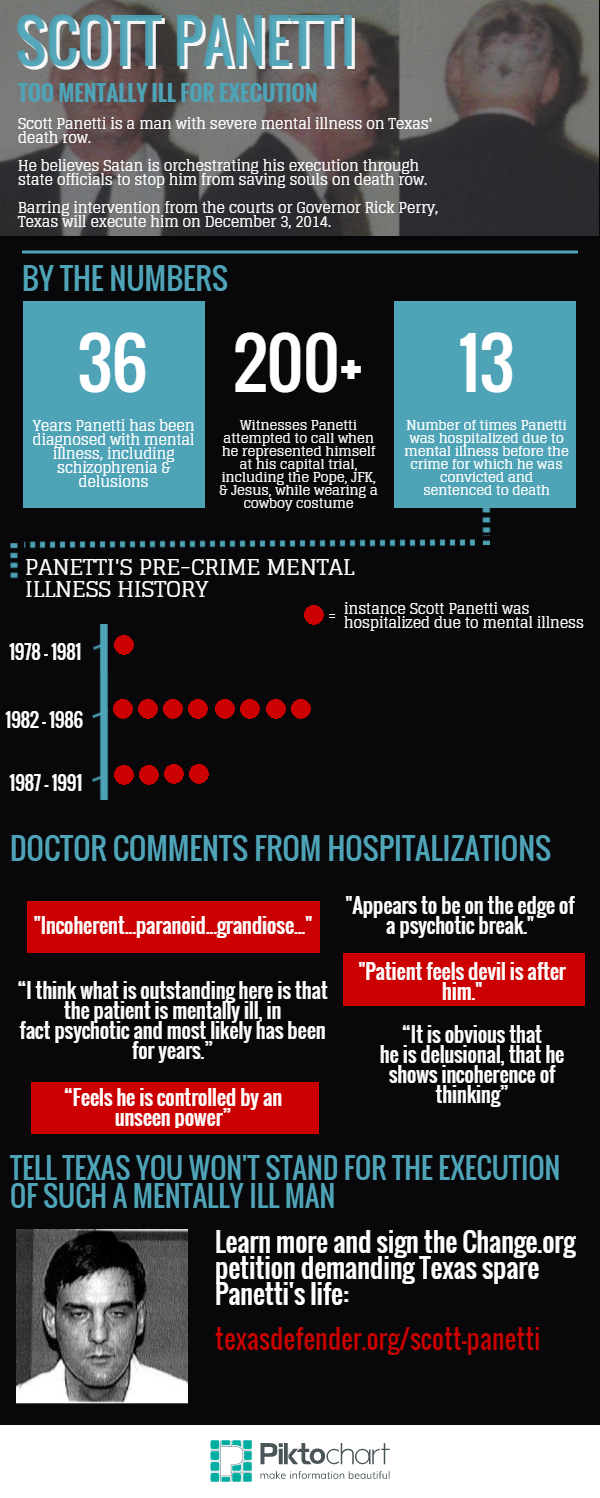 (Click to enlarge). On November 12, the American Psychiatric Association, Mental Health America, 30 former judges, prosecutors, and Attorneys General, 50 evangelical faith leaders, and the American Bar Association joined many others in calling on Texas Governor Rick Perry to commute the sentence of death row inmate Scott Panetti because of his severe mental illness. Despite his long history of hospitalization in mental…