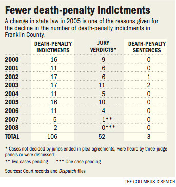 Ohio’s Franklin County (Columbus) has been experiencing a steady decline in death penalty indictments and death sentences as jurors are increasingly choosing sentences of life in prison without parole and prosecutors are seeking fewer death sentences. In a recent capital case, the judge had a difficult time finding jurors who would likely follow state law and consider a death sentence. One prospective juror, a 36-year-old truck driver, explained that while he…