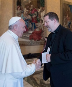 Those comments provoked a rebuke from Rev. Paul Mueller (pictured, right, with Pope Francis), vice director and superior of the Jesuit community at the Vatican Observatory, and a high school classmate of Deters. In a letter to the prosecutor, Father Mueller wrote, “I am disappointed, embarrassed, and scandalized that you, not only a Catholic but also a fellow alumnus of St. Xavier High School, have used the platform of your public office to oppose and confuse the moral teaching of the Church in so open a fashion.”