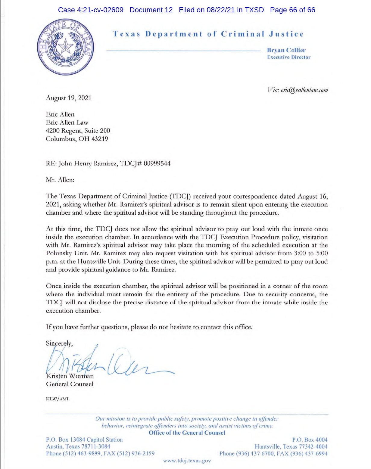 Texas again responded by amending its execution protocol on April 21, 2021, this time permitting a condemned prisoner to be accompanied in the execution chamber by a spiritual adviser of his or her own choosing. However, when Ramirez requested that his pastor be permitted to pray out loud and lay hands on him during the execution process, TDCJ refused. Ramirez’s lawyer, Seth Kretzer said under the TDCJ restrictions, Ramirez’s pastor “will not be allowed to speak in any way. He cannot pray aloud. He cannot sing a prayer. He cannot do anything in this room except basically stand in a corner and breathe.”