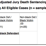 The race of the defendant is a much stronger predictor that a case will result in a death sentence than the fact that the crime was committed along with another felony (0.8) or that the defendant killed with multiple stab wounds (0.9). Either when the prosecutor decides to seek the death penalty in a particular case, or when the jury decides that death is the appropriate sentence, on average, black defendants are considered “worse,” regardless of the other factors in their case.