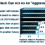 The race of the defendant is not supposed to influence whether a person is sentenced to death, but in Philadelphia it clearly does. (See Chart below.) Murders by blacks are treated as more severe and “deserving” of the death penalty because of the defendant’s race. Being a black defendant merits a score of 1.4 in predicting whether a death sentence will ultimately result. This extra burden for black defendants is comparable to such legitimate aggravating factors as torture or “causing great harm, fear or pain,” which earned scores of 1.9 and 1.0 respectively, in predicting the sentence. Stated differently, in Philadelphia, the capital sentencing statute has operated as though being black was not merely a physical attribute, but as if it were one of the most important aggravating factors actually justifying the death penalty.