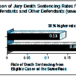 The raw data of death sentences in Philadelphia between 1983 and 1993, provide the first piece of disturbing evidence that race discrimination may be operating. The rate at which eligible black defendants were sentenced to death was nearly 40% higher than the rate for other eligible defendants. A sentencing rate is simply a ratio of the number of death sentences for a particular group compared to the total number of cases of that group which would be eligible for a death sentence. In the chart below, a death sentencing rate of .18 for blacks means that for every 100 eligible black defendants, 18 will be sentenced to death. For other defendants, only 13 out of 100 will be similarly sentenced.