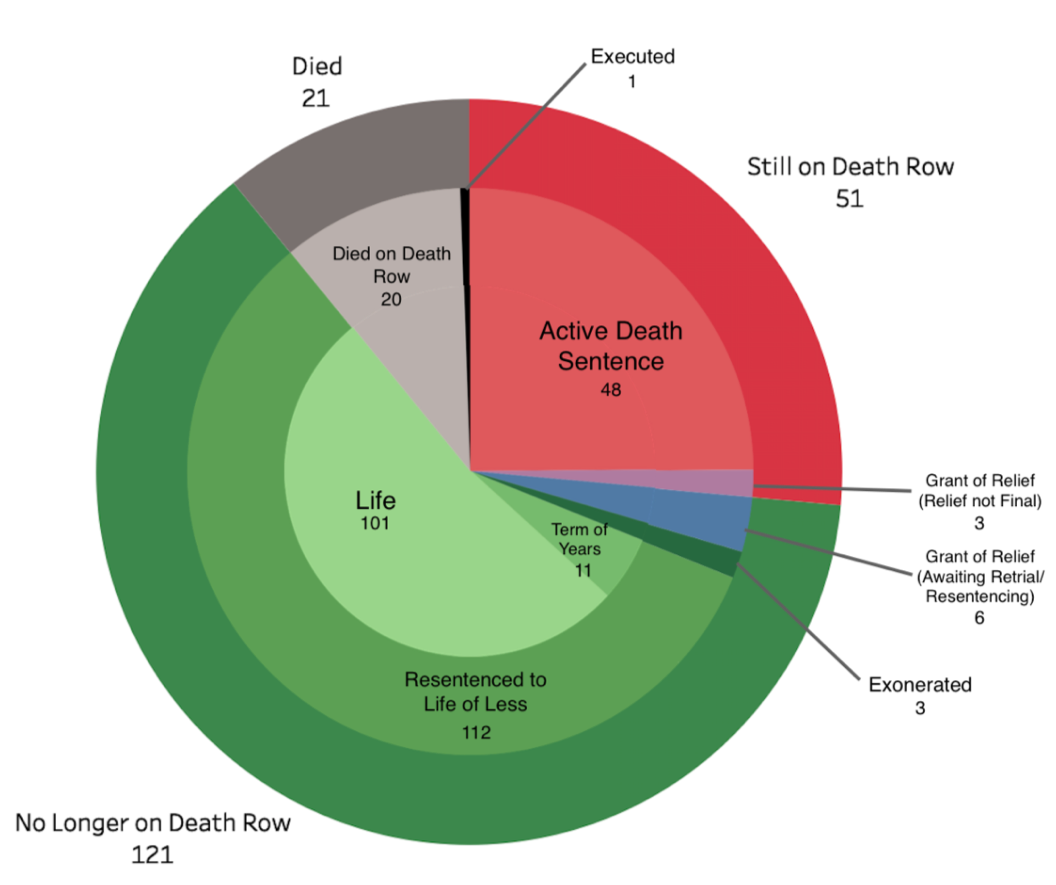 Data tracking the final dispositions of cases in which Pennsylvania prosecutors had provided notice of intent to seek the death penalty showed that between 2011 and 2017, 98.7% of the 225 cases in which Philadelphia prosecutors had sought the death penalty ended with a non-capital outcome. Similarly, 99.5% of the 201 death sentences imposed in the city — mostly in the 1980s and 1990s — have not resulted in an execution. Two thirds of the convictions or death sentences have already been reversed in the courts and 115 of the former death-row prisoners have since been resentenced either to life sentences (101) or a term of years (11) or been exonerated (3). The single execution was of a severely mentally ill man whom courts initially found incompetent to waive his rights, but was later permitted to be executed.