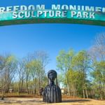 Following the path of trafficked enslaved people, visitors can choose to enter the park by boat, crossing the Alabama River. Visitors are first provided with a brief history of Indigenous peoples in America, and then will learn about the history of slavery, with sections of the park specifically covering the slave trade, laws pertaining to the practice, and acts of resistance. The park includes a mixture of historical artifacts, including 170-year-old plantation dwellings and a whipping post, recreations, and 48 sculptures by 27 artists, half of which are newly commissioned works. The Freedom Monument Sculpture Park is the latest addition to EJI’s existing legacy sites – the National Memorial for Peace and Justice and the Legacy Museum.