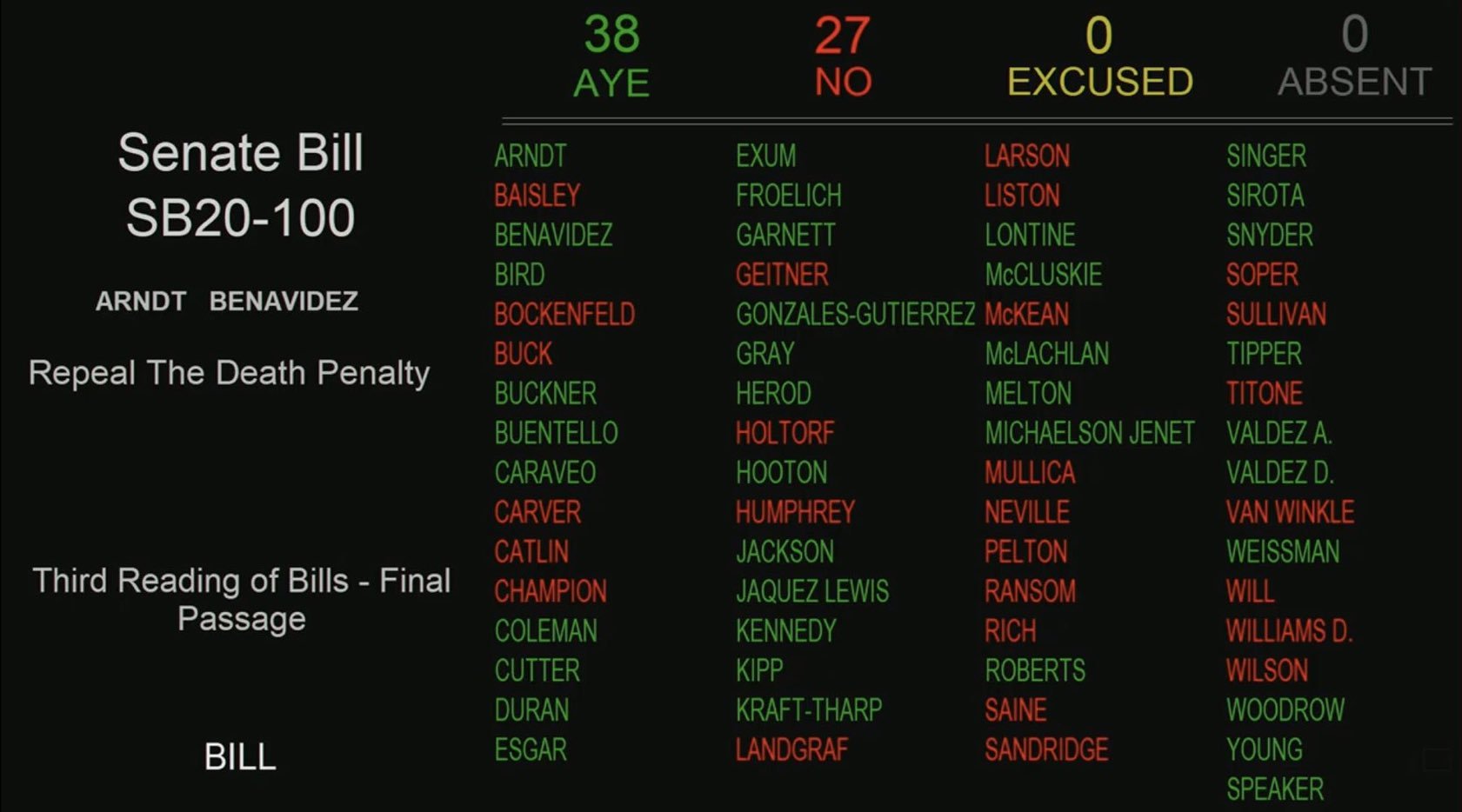 | Colorado* | SB 20 – 100 would repeal the death penalty for offenses charged on or after July 1, 2020 | Introduced January 14, 2020 and assigned to the Senate Judiciary Committee. After a public hearing, the bill PASSED committee on January 27 by a 3 – 2 vote. After a floor debate, it PASSED the full Senate on January 30, by a 19 – 13 vote, with 3 Republicans joining 16 Democrats in supporting the bill and 2 Democrats joining 11 Republicans in opposing. The bill was introduced in the House and referred to the Judiciary Committee on February 4. After a public hearing, it PASSED the Judiciary Committee on February 18 by a vote of 6 – 3. It PASSED second reading on a voice vote of the full House on February 25. The bill PASSED Third Reading by a vote of 38 – 27 on February 26. It was officially transmitted to the governor on March 13. SIGNED by Governor Jared Polis on March 23. Governor Polis commuted the sentences of the three men on death row to life without parole. | January 8, 2020-May 6, 2020 |