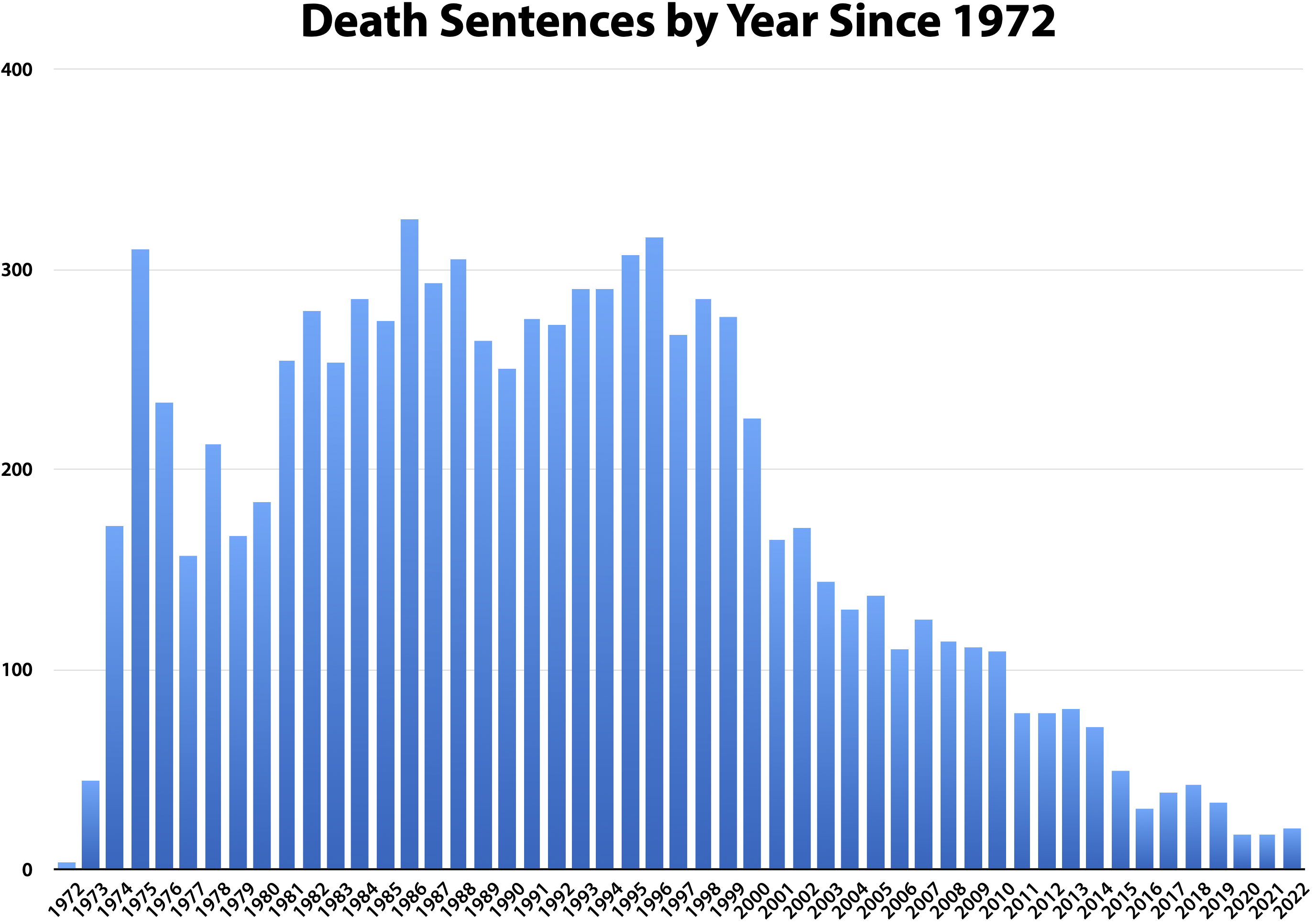 SOURCES: DPI’s Death Penalty Census and annual death sentence tracking. Each year, DPI collects information on the number of death sentences in the United States. We contact state agencies, state death penalty organizations, and death penalty litigators, and review news reports to confirm the numbers. We only count the number of “new sentences,” i.e., we do not recount individuals who were sentenced to death in a previous year, had their sentenced overturned, and were resentenced in the current year. Sentences are only counted when a judge imposes the sentence, even though a jury may have returned a death verdict earlier.