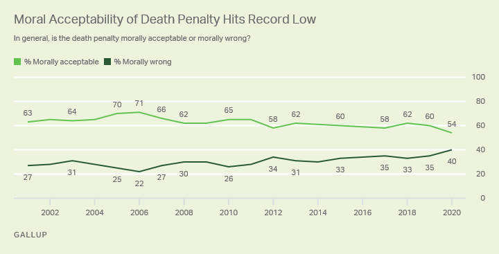 Megan Brenan, Record-Low 54% in U.S. Say Death Penalty Morally Acceptable, Gallup News, June 23, 2020; Zach Budryk, Percentage of Americans who say death penalty is morally acceptable at record low: Gallup, The Hill, June 23, 2020; Clyde Hughes, Poll: Record share of Americans say death penalty ‘unacceptable’, UPI, June 23, 2020.
