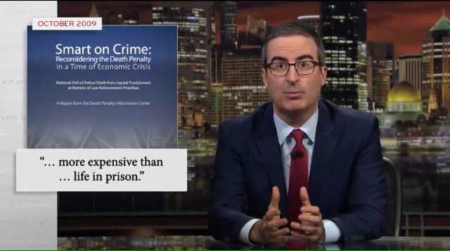 In the twenty-minute segment, Oliver outlined several of the reasons he opposes the death penalty, including wrongful convictions, lack of deterrent effect, and cost. “There’s actually no proof it has an effect on bringing down crime, [and] it’s technically more expensive to execute someone than to keep them in prison for life,” he explained, citing DPIC’s 2009 report, Smart on Crime, for data on the cost of capital punishment. “According to one study, around 4% of people sentenced to death are actually innocent, which in itself, should give us pause about the whole enterprise,” he added.