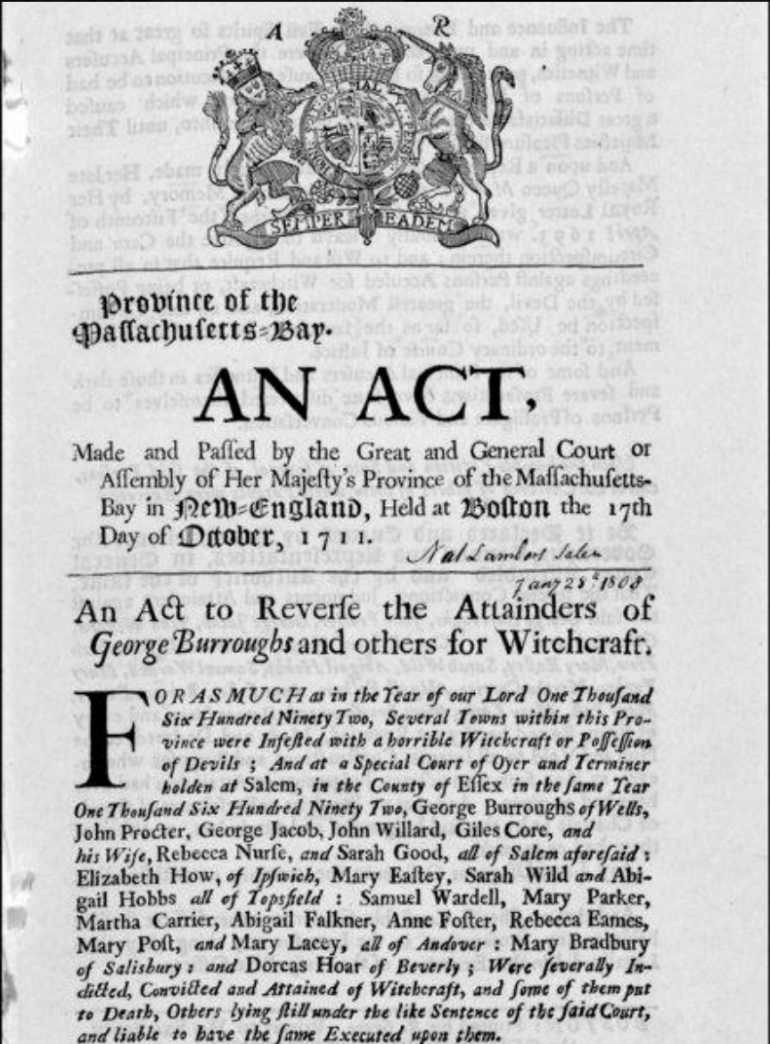 In 1711, the colonial legislature reversed 22 of the convictions, acting on petitions from some of the accused and the children of those who were executed (see image, right). After Arthur Miller’s play, The Crucible, drew attention to the witch trials as an allegory for the political witch hunts of the 1950s, Massachusetts enacted legislation in 1957 to exonerate more of the accused. The legislature passed another bill in 2001 to exonerate the falsely accused, but again failed to identify Johnson’s case.