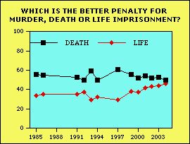 Over the years, support for the sentence of Life Without Parole as an alternative to the death penalty has steadily increased, to the point where now the country is evenly split on capital punishment. In 1994, only 32% favored Life, with 50% favoring death. In 2004, support for life without parole had grown to 46%.