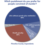 Of Miami-Dade respondents who chose a life-sentencing option, a plurality (40%) preferred life without parole, plus restitution; 18% preferred life with the possibility of parole after 40 years; and 17% preferred life without possibility of parole. In Pinellas, 48% preferred life without parole plus restitution; 12% preferred life without parole; and 8% chose life with parole eligibility after 40 years.