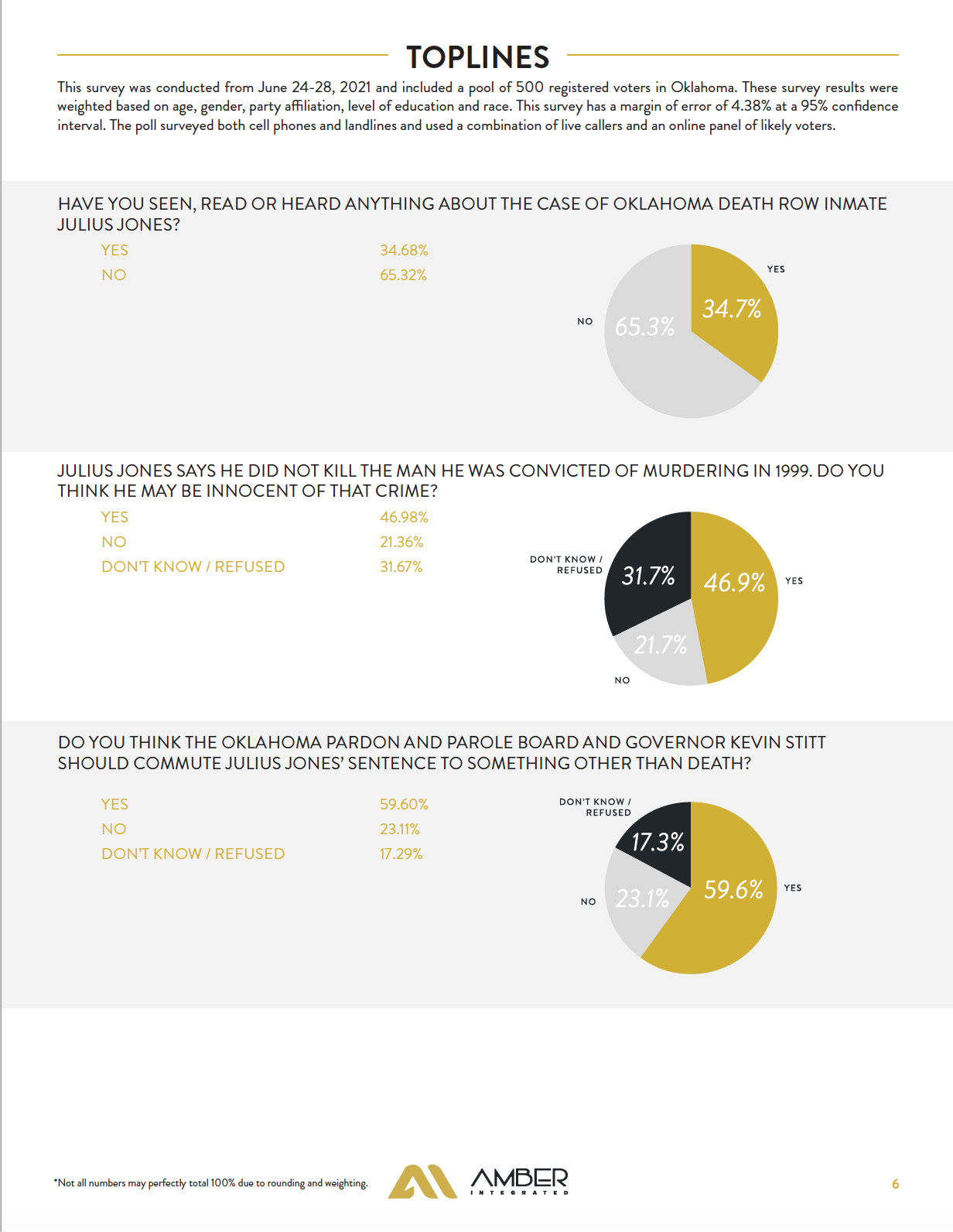 A survey of 500 registered voters in Oklahoma, conducted June 24 – 28, 2021 by the Oklahoma polling firm Amber Integrated, has found that 60% of those who said they knew anything about the case of death-row prisoner Julius Jones believe Oklahoma authorities should commute his death sentence. The poll results are virtually identical to those in an Amber Integrated public affairs survey conducted from December 14 – 17, 2020, except that a significantly larger percentage of Oklahomans are now aware of the case.