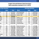 The longest period of time between state executions in the post-Gregg era is 858 days, from the January 17, 1977 execution of Gary Gilmore in Utah — the first execution of the modern era — to the May 25, 1979 execution of John Spenkelink in Florida. Gilmore had given up his appeal rights and asked to be executed. 150 days passed between Spenkelink’s and Nevada’s execution of Jesse Bishop, also a volunteer, on October 22, 1979. Bishop’s execution was followed by the execution of another volunteer, Steven Judy, in Indiana 504 days later, on March 9, 1981. 519 days later, Virginia executed Frank Coppola on August 10, 1982. Coppola also waived his appellate rights.