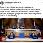 Tweet from Sierra Leone President Julius Maada Bio: Today I have ful­filled a gov­er­nance pledge to per­ma­nent­ly abol­ish the death penal­ty in Sierra Leone.”