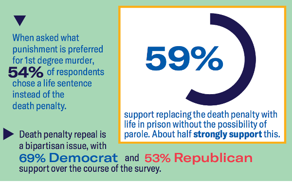 Despite the historically racially divisive nature of capital punishment, death-penalty replacement drew strong support across racial lines. Hispanics were most supportive of substituting life without parole for the death penalty (68%), followed closely by African Americans (64%). A majority of Whites (58%) also supported eliminating the death penalty. Women were more supportive of repealing the death penalty (62%) than men (56%). Every age demographic also favored ending capital punishment, with young people (18 – 34) the most supportive of abolition (62%). However, those aged 35 – 44 and over 65 were nearly as supportive (61%). Support for replacing the death penalty dipped slightly, to 55%, among those aged 45 – 64.