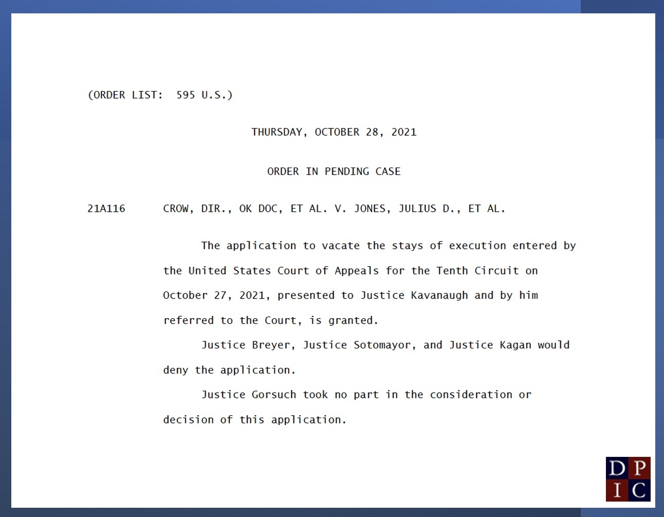 The Supreme Court’s action, over the dissents of Justices Stephen Breyer, Sonia Sotomayor, and Elena Kagan, with Justice Neil Gorsuch not participating, came just hours before Grant’s scheduled 4:00 p.m. Central execution. Without opinion, the Court lifted an emergency order the U.S. Court of Appeals for the Tenth Circuit had issued October 27 that had stayed Grant’s execution and the November 18 execution of Julius Jones.