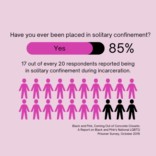 Studies show that incarcerated LGBTQ+ people are more likely to be placed in solitary confinement than others. Black and Pink’s 2015 survey found that 85% of respondents had been placed in solitary confinement at some point during their incarceration, with more than 50% of individuals spending two or more years in isolation.