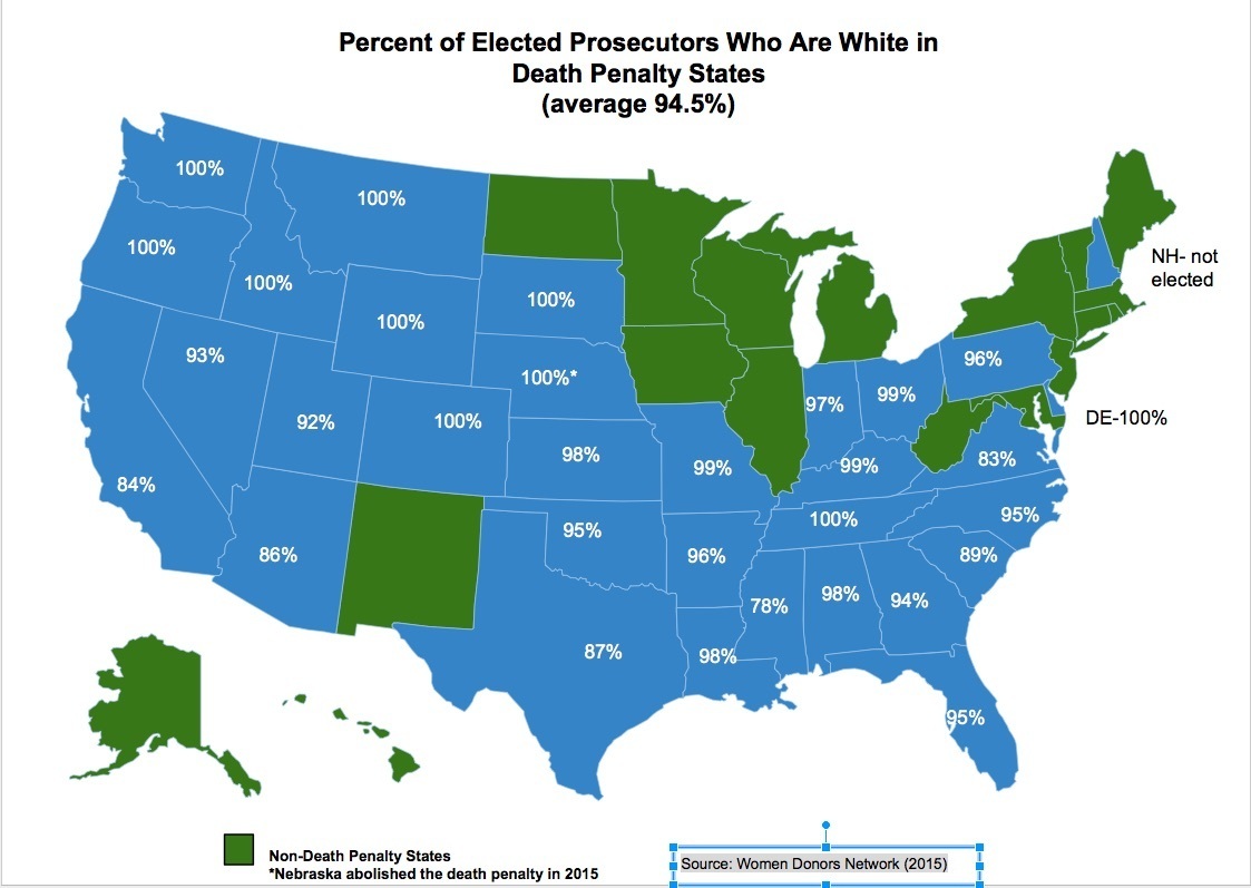- A 1998 examination of Chief District Attorneys in states with the death penalty found that nearly 98% are white, 1% are black, and 1% are Hispanic.
