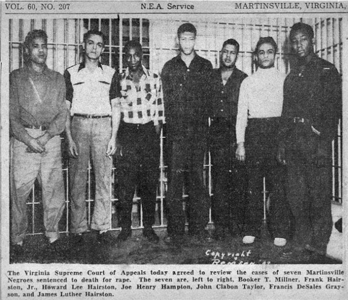 In 1949, seven young Black men were accused of the rape and beating of a white woman in Martinsville, Virginia. The seven — Francis DeSales Grayson, Frank Hairston Jr., Howard Hairston, James Luther Hairston, Joe Henry Hampton, Booker T. Millner, and John Clabon Taylor — were interrogated by police without the appointment of legal counsel. Under threats that they would be released to a lynch mob if they denied involvement, each confessed to participating in the rape. After a succession of perfunctory trials before all-white, all-male juries, each was convicted and sentenced to death. They were executed in 1951 in the largest mass execution for rape in U.S. history.