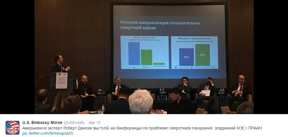 United Nations’ Death Penalty Conference in Minsk, Belarus. The United Nations, with the cooperation of the Belarus Foreign Ministry, held an international death penalty conference, The Death Penalty: Transcending the Divide, in Minsk, Belarus on March 10, 2016. Belarus is the only country in Europe that still carries out the death penalty. The conference featured presentations by Stavros Lambrinidis, the European Union Special Representative for Human Rights; Andrea Rigoni, a member of the Italian Parliament and representative of the Parliamentary Assembly of the Council of Europe; former Czech Republic Minister of Foreign Affairs Karel Schwarzenberg; and Belarus Minister of Foreign Affairs, Vladimir Makei, among others. DPIC Executive Director Robert Dunham presented to the conference on using a multidisciplinary approach to analyze policy issues relating to the administration of capital punishment. (Photo courtesy U.S. Embassy, Minsk: DPIC Executive Director Robert Dunham (DPIC) speaks at the UN death penalty conference in Minsk.)
