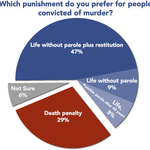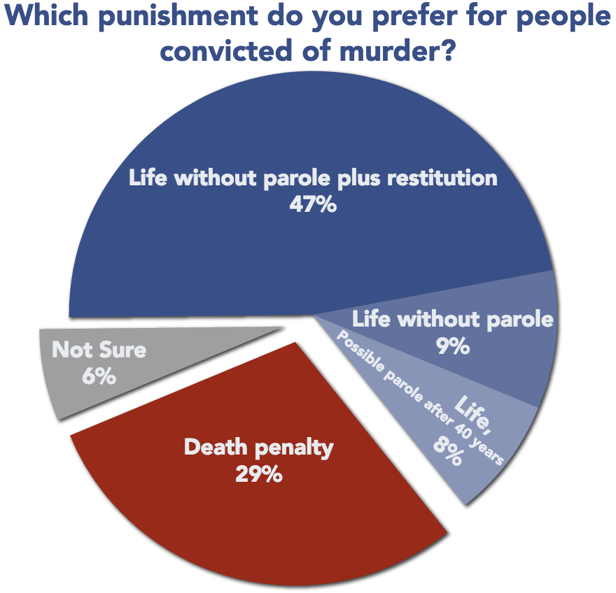 - 46% would prefer life in prison without the possibility of parole as an alternative to the death penalty for first degree murderers