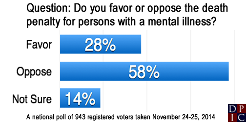 (“New Nationwide Poll Shows Americans Oppose Death Penalty in Cases where Person has Mental Illness By 2 – 1 Margin,” Prof. Robert Smith, Press Release, December 1, 2014; Public Policy Polling, National Survey Results, November 24 – 25, 2014). See Public Opinion and Mental Illness.