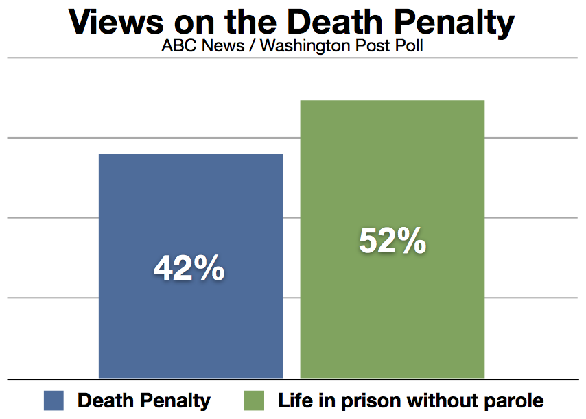 A new poll by ABC News and the Washington Post found a majority (52%) of Americans prefer life without parole as punishment for convicted murderers, with just 42% preferring the death penalty. This is the first time that this poll has found a majority support for life without parole over the death penalty. Without an alternative sentence offered, support for the death penalty was 61%, equaling the lowest level of support in polls going back to the early 1980s, and showing a significant drop since support for the death penalty peaked at 80% in 1994. Even among those who said they support the death penalty in the abstract, 29% preferred the alternative of life without parole when offered a choice between the two punishments. In states that do not have capital punishment, respondents were more likely to prefer life without parole (58%), with only 38% selecting the death penalty. Among the groups that had stronger than average support for life without parole were women (57%), nonwhites (65%), and Democrats (67%).