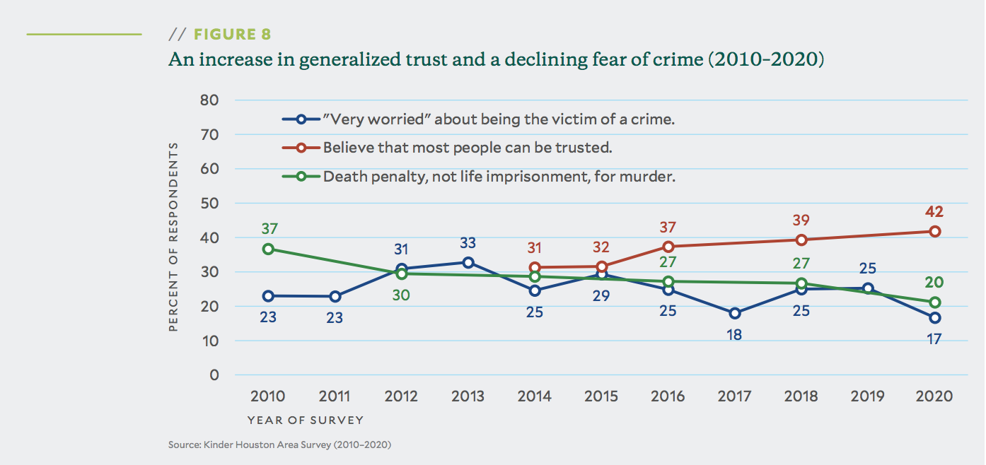 The survey linked respondents’ death-penalty attitudes to broader shifts in opinions on crime and punishment. Just 11% of residents named crime as the biggest problem facing Houston — the lowest number in the 39 years of the survey. The percentage who said they were very worried about being a victim of crime also hit a record low, at 17%. Houstonians’ support for harsh punishments for low-level drug crimes also declined. Most respondents (70%) said possession of small amounts of marijuana should not be a criminal offense, a major shift since the question was last asked in 2003, when a 56% majority said marijuana possession should be criminalized. “The decline in punitiveness is consistent with the other evidence showing the growth in empathy and in the acceptance of differences that seems to be developing among Houston area residents,” the report’s authors wrote.
