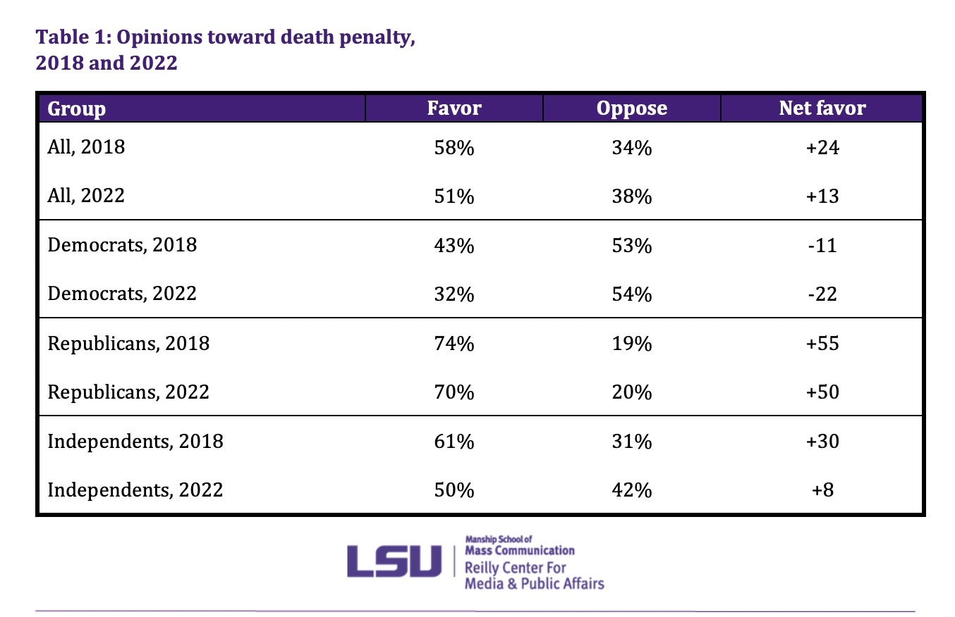 Support for capital punishment in Louisiana has fallen by seven percentage points in the last four years, according to the 2022 Louisiana Survey by the Reilly Center for Media & Public Affairs at Louisiana State University.