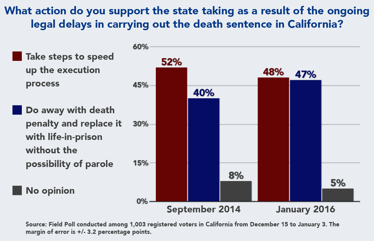 A recent survey of Californians conducted by The Field Poll found that voters are evenly split between wanting to speed up the execution process (48%) and supporting repeal of the death penalty and replacing it with life without parole (47%). Support for repeal has grown since 2014, when the question was last asked. At that time, 40% favored replacing the death penalty with life without parole and 52% supported speeding up the process. Californians may face a choice between the two options in November, as competing initiatives have been proposed. Republicans, whites, and voters over age 50 were more likely to support speeding up executions, while Democrats, Hispanics, blacks, and voters under 50 favored repealing the death penalty. “There continues to be a very strong movement away from support for the death penalty in California,” said Matt Cherry, executive director of Death Penalty Focus, an organization that is supporting the initiative to repeal the death penalty. (click graphic to enlarge).