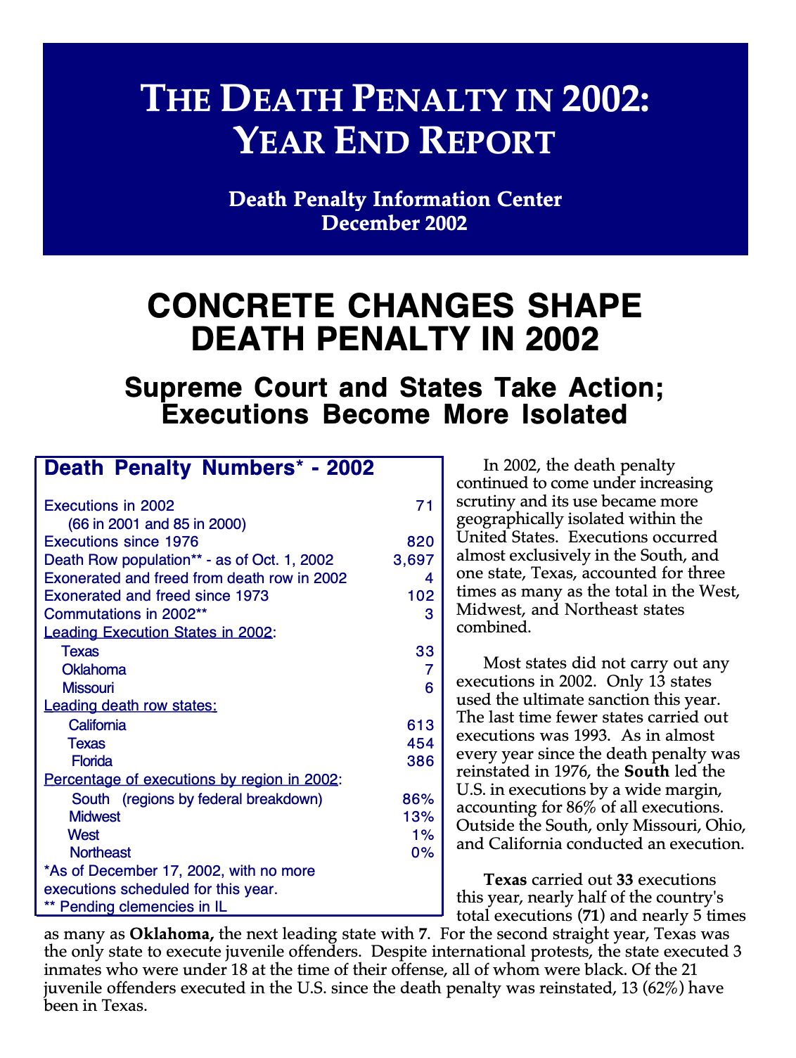In 2002, the death penalty continued to come under increasing scrutiny and its use became more geographically isolated within the United States. Executions occurred almost exclusively in the South, and one state, Texas, accounted for three times as many as the total in the West, Midwest, and Northeast…