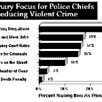The police chiefs were also asked to select their primary choices from a list of possible ways to reduce violent crime. The need to reduce the prevalence of drug abuse was their first priority. They also chose longer prison sentences for criminals, fewer technical legal barriers to the prosecution of criminals, more police officers on the street, a better economy with more jobs, and reducing the number of guns over an expanded use of the death penalty as better ways to lower crime. Capital punishment ranked a distant last, with only 1% of the chiefs citing it as their primary focus for stopping violent crime. These results are illustrated in Figure 1 below.