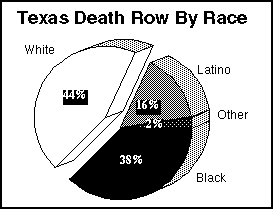 Racism in the death penalty does not fully explain the pace of executions or the size of death row in Texas. However, it is a recurrent and largely untreated sore which skews the use of the death penalty in Texas and eats away at the hope for better relations among the races. A Texas governmental report showed that racial disparities are evident in other areas of criminal justice, as well. For example, the incarceration rate for blacks in Texas is over eight times the rate for whites. [47] Almost half of black offenders are sentenced to prison, but less than one-third of white offenders are so sentenced. [48]