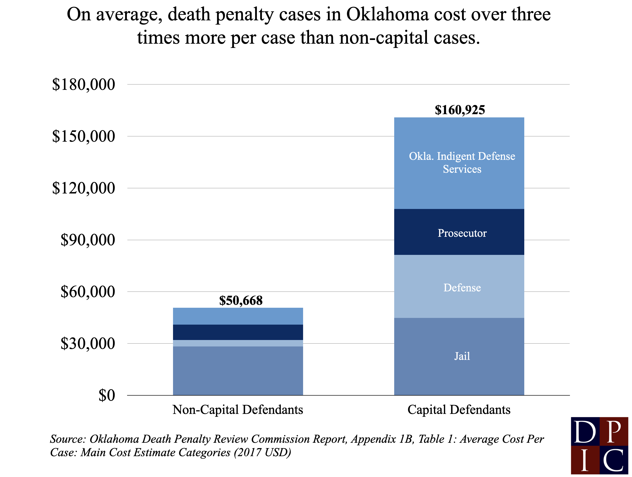 On average, capital cases are over three times more expensive than non-capital cases in Oklahoma, not including the differences in the costs of keeping someone on death row.Conservative estimates place the average cost of an Oklahoma death penalty case at approximately $161,000, even before considering the cost of incarceration after conviction. Non-capital cases cost $51,000 per case, on average — 3.3 times less than death penalty cases. State capital appeals drive much of the differences in costs as these appeals are 5.4 times more expensive than non-capital appeals. The state also spends twice as much money per person per day housing people on death row compared to the estimated cost of housing people sentenced to life in prison.