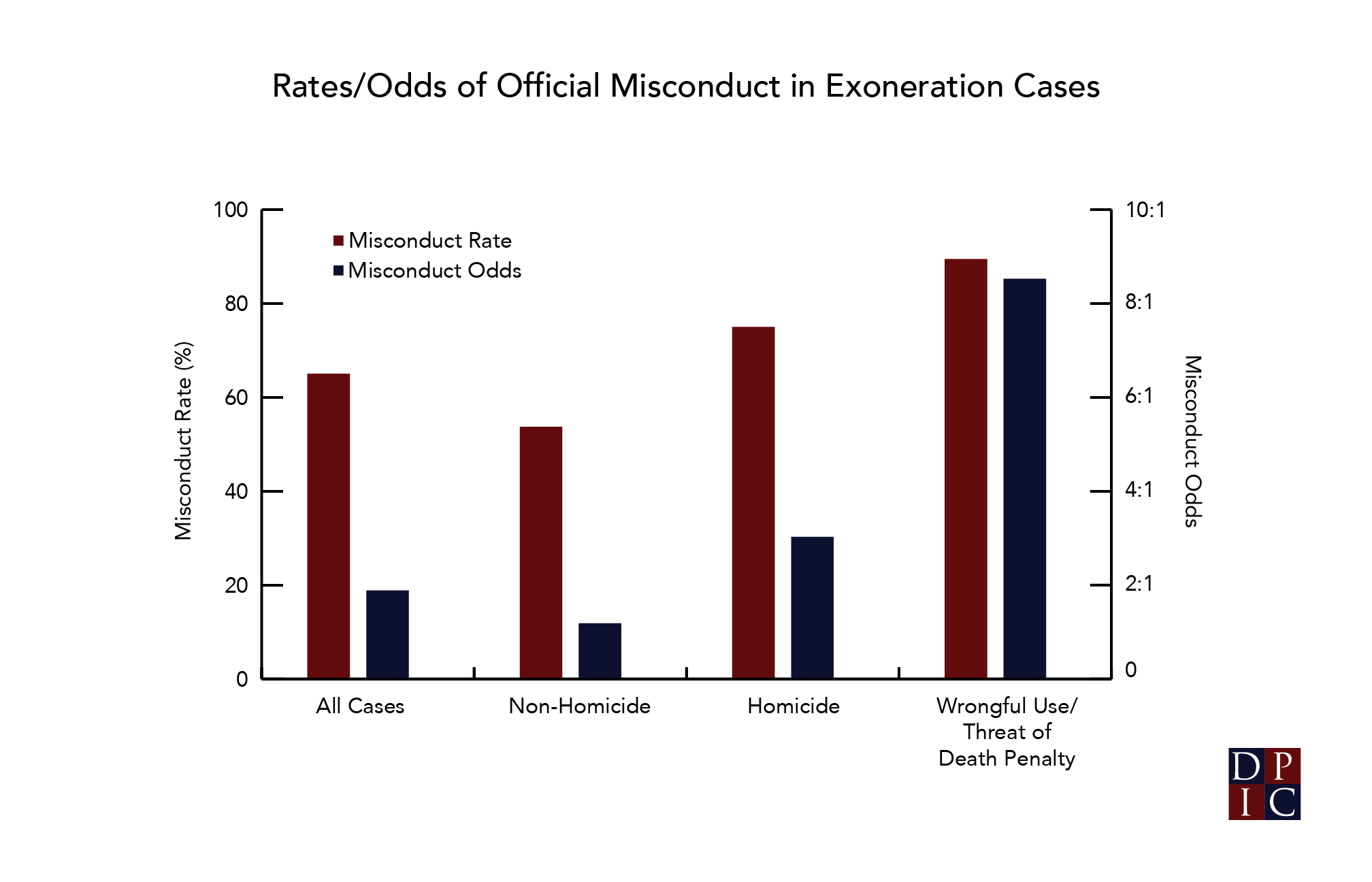 - As compared to homicide exonerations as a whole, Official Misconduct was nearly twenty percent more likely (19.3%) when a case involved wrongful use or threat of the death penalty, and the odds that Official Misconduct would be present as a factor were 2.83 times greater than for homicide exonerations as a whole.