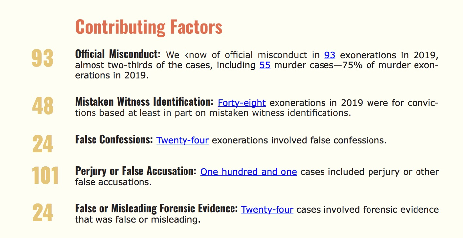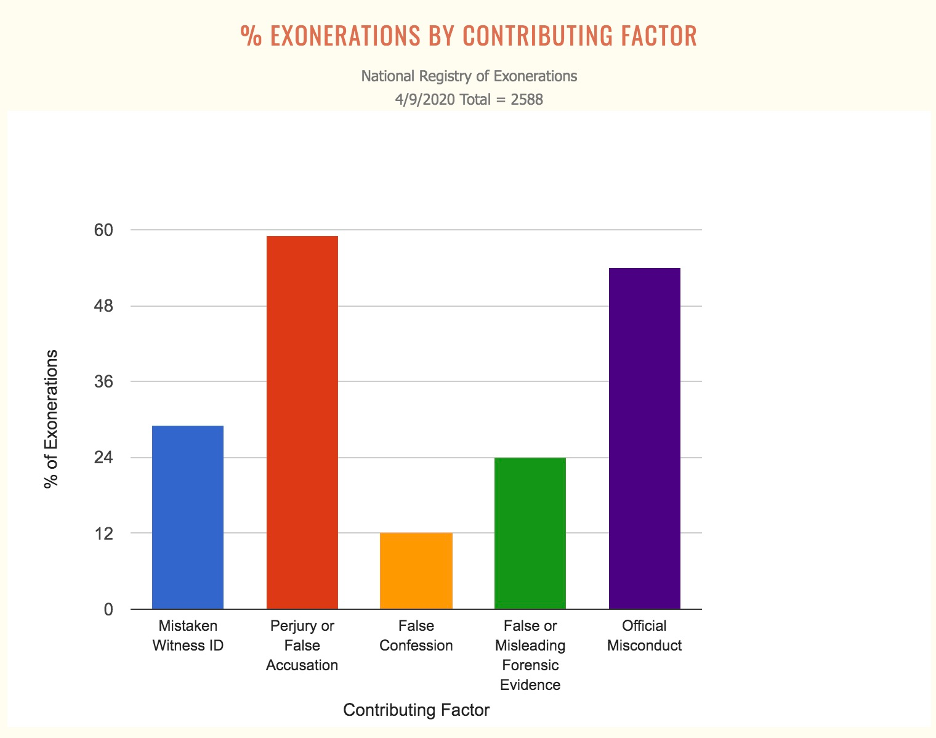 Historically, official misconduct and perjury or false accusation have been the leading factors contributing to the wrongful conviction of innocent men and women in the United States. As of April 9, 2020, the National Registry of Exonerations reported that Perjury or False Accusation contributed to 58.5% of the 2,588 exonerations it has identified. Official Misconduct was a factor in 53.8% of the exoneration cases. No other factor came close as a contributing cause to wrongful convictions.