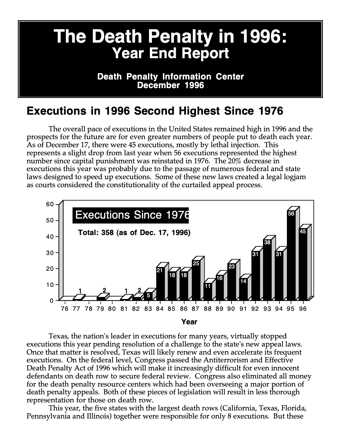The overall pace of executions in the United States remained high in 1996 and the prospects for the future are for even greater numbers of people put to death each year. As of December 17, there were 45 executions, mostly by lethal injection. This represents a slight drop from last year when 56 executions represented the highest number since capital punishment was reinstated in 1976. The 20% decrease in executions this year was probably due to the passage of numerous federal and state laws designed to speed up executions. Some of these new laws created a legal logjam as courts considered the constitutionality of the curtailed appeal process.