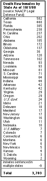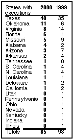 Executions in 2000 declined 13% from the previous year, but still remained high at 85, the second highest number since the death penalty was reinstated in 1976. A closer look at these executions shows that almost 90% occurred in the South. Only 3 states (Arizona, California and Missouri) outside of the South conducted an execution this year. Texas, alone, with 40 executions, accounted for almost as many executions as all the rest of the states combined.