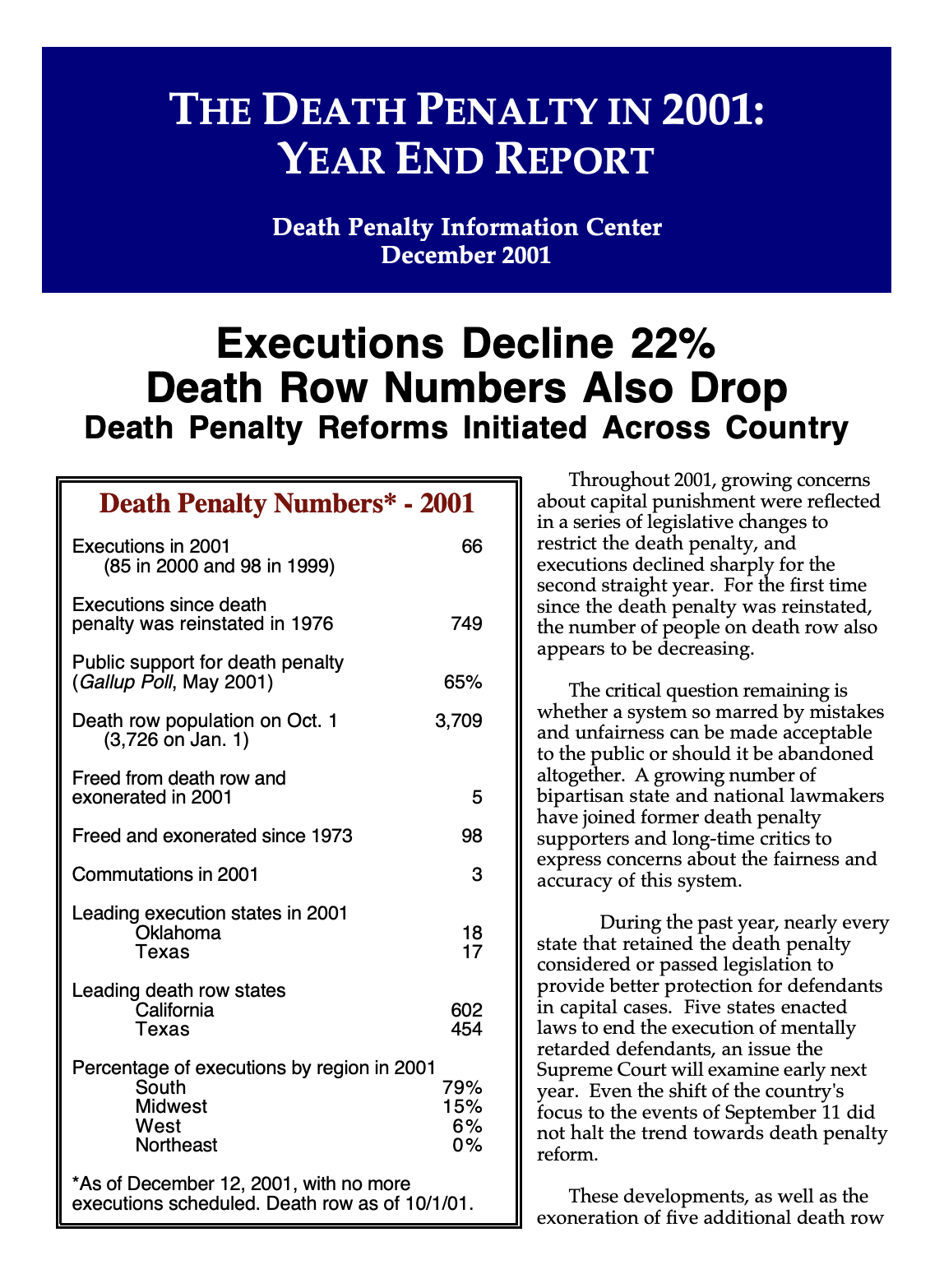 Throughout 2001, growing concerns about capital punishment were reflected in a series of legislative changes to restrict the death penalty, and executions declined sharply for the second straight year. For the first time since the death penalty was reinstated, the number of people on death row also appears to be decreasing.
