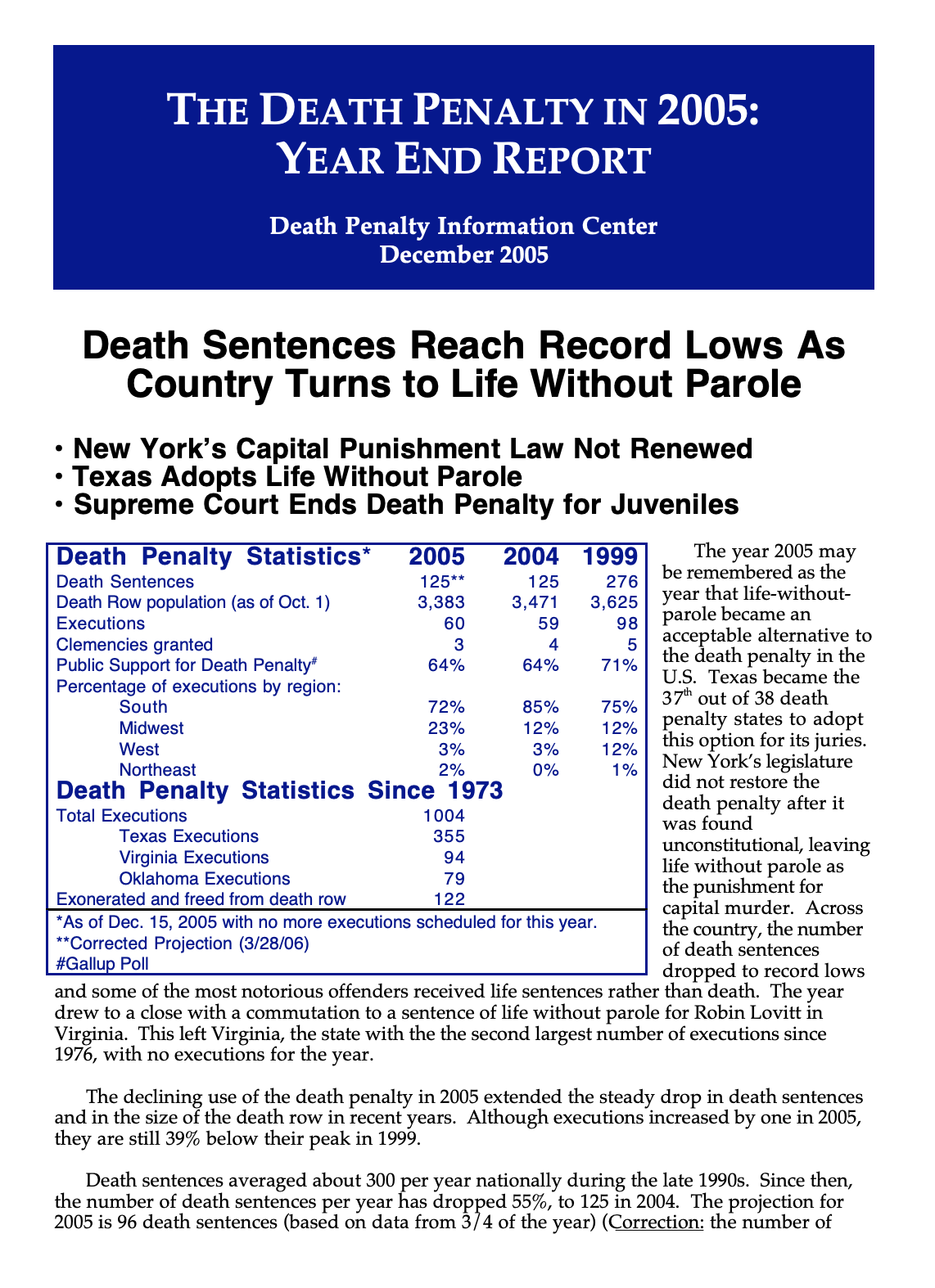 The year 2005 may be remembered as the year that life without parole became an acceptable alternative to the death penalty in the U.S. Texas became the 37th out of 38 death penalty states to adopt this option for its juries. New York’s legislature did not restore the death penalty after it was found unconstitutional, leaving life without parole as the punishment for capital murder. Across the country, the number of death sentences dropped to record lows and some of the most notorious offenders received life sentences rather than death. The year drew to a close with a commutation to a sentence of life without parole for Robin Lovitt in Virginia. This left Virginia, the state with the second largest number of executions since 1976, with no executions for the year.