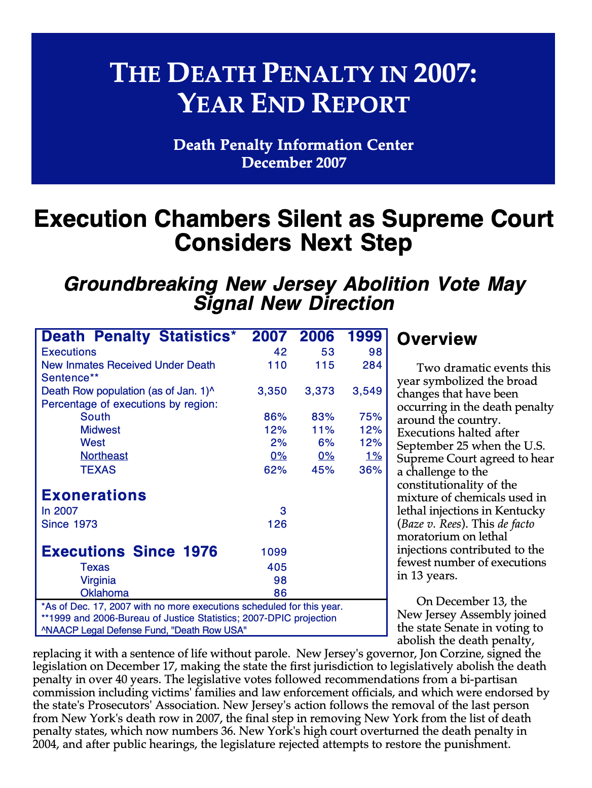 Two dramatic events this year symbolized the broad changes that have been occurring in the death penalty around the country. Executions halted after September 25 when the U.S. Supreme Court agreed to hear a challenge to the constitutionality of the mixture of chemicals used in lethal injections in Kentucky (Baze v. Rees). This de facto moratorium on lethal injections contributed to the fewest number of executions in 13 years.