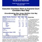 On December 13, the New Jersey Assembly joined the state Senate in voting to abolish the death penalty, replacing it with a sentence of life without parole. New Jersey’s governor, Jon Corzine, signed the legislation on December 17, making the state the first jurisdiction to legislatively abolish the death penalty in over 40 years. The legislative votes followed recommendations from a bi-partisan commission including victims’ families and law enforcement officials, and which were endorsed by the state’s Prosecutors’ Association. New Jersey’s action follows the removal of the last person from New York’s death row in 2007, the final step in removing New York from the list of death penalty states, which now numbers 36. New York’s high court overturned the death penalty in 2004, and after public hearings, the legislature rejected attempts to restore the punishment.